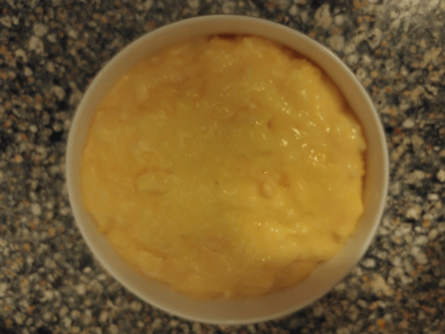 In a separate container, mix about 3 cups dry quick-cooking grits with about 3 cups of hot water (just from the spigot will be fine). Sometimes I use 2 cans of Campbell’s chicken broth instead of the water. (The chicken broth obviously adds calories; if someone is needing the extra nourishment those calories will provide, I use the broth.)