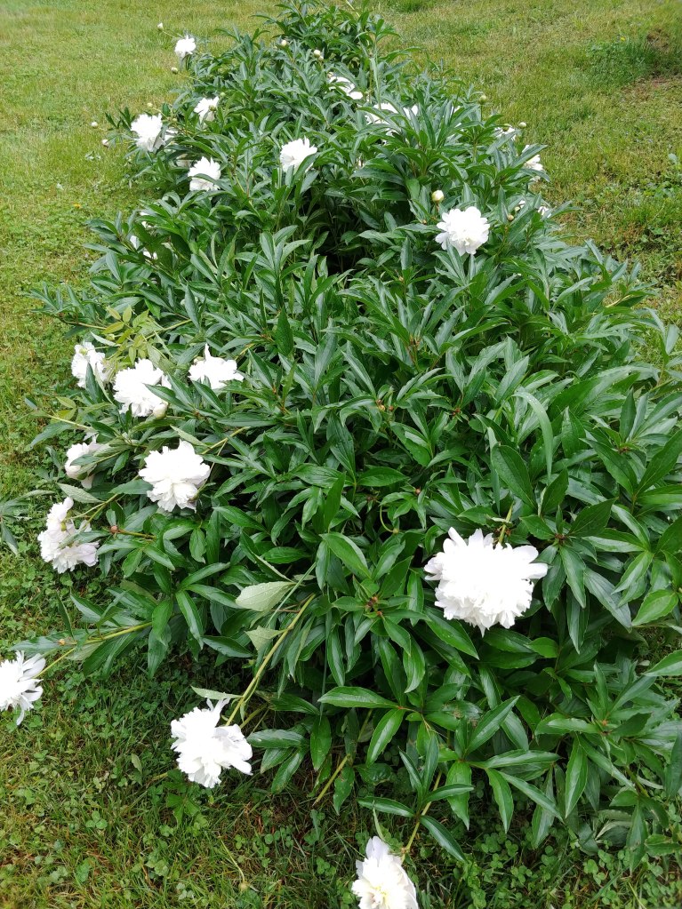These are peonies that were almost always in bloom with Aunt Alice visited in the spring. They were transplanted from the Moore farm in the spring of 1942 when my grandparents moved to Johnson City. This is their third home after that transplantation, so it’s their fifth home. I always breathe a sigh of relief when I see the buds.
