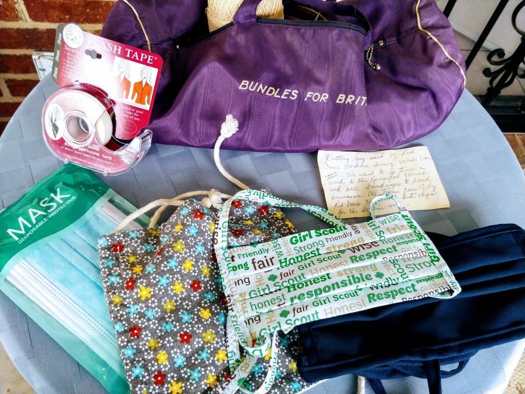 These efforts remind me of the masks that many of us have made, purchased or been gifted to hopefully protect us from getting COVID-19. In the picture, you’ll see a package of medical masks I bought, a calico mask made by Margaret Goergen, a friend I met at church, but whom I know best from The Monday Club, as well as through her sister, Carol Dubay. Dede Norungolo, former assistant executive director of Girl Scouts of the Appalachians Council, made the mask with Girl Scout-themed words. I ordered the blue mask from the L.C. King Company, a Bristol-Tennessee based manufacturer of high quality work clothing since 1913. The fashion tape is to tape the mask to my face, should the need arise.
